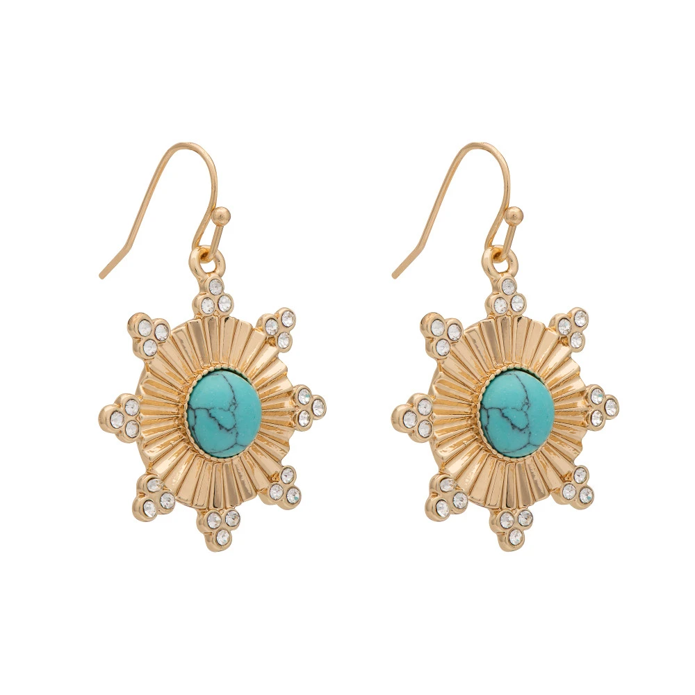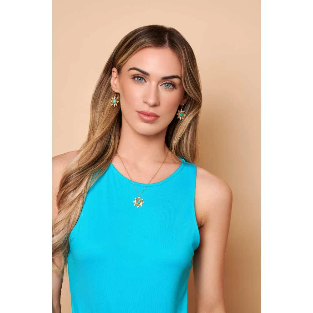 Introducing the Cleo earrings, the earrings feature hanging gold pendants with a turquoise stone in the centre. The Cleo earrings offer a versatile and classic touch to any outfit. Wear alone for a stand alone look or pair with matching necklace to complete any outfit. Presented in a gift box, with a 1-year International Warranty.