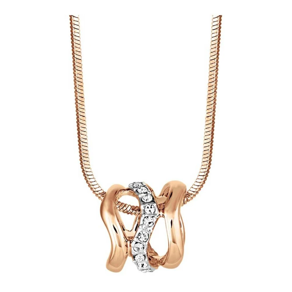 Soft waves of champagne rose gold and rhodium plated bands come together with subtle crystal details and adelicate snake chain to create a stunning and intricate design. The pendant has a beautiful fluid quality which is sure to make a style statement whilst creating a flattering look any time of the day.