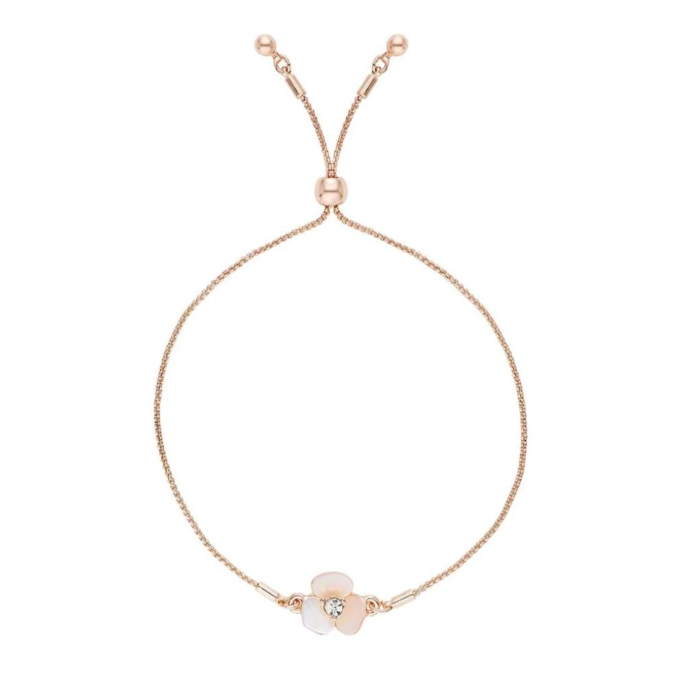 Enhance your wrist with a touch of feminine chic by Buckley London. Placed upon a fine rose gold plated chain, a beautiful flower charm is formed with smooth iridescent mother of pearl petals, and complete with a captivating stone set centre. This understatedly elegant piece is finished with a sliding clasp for adjustable sizing.