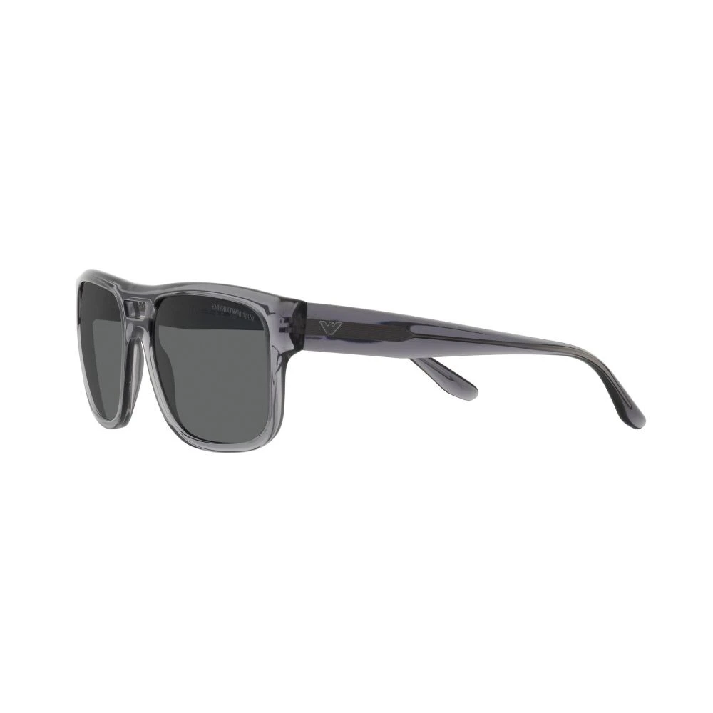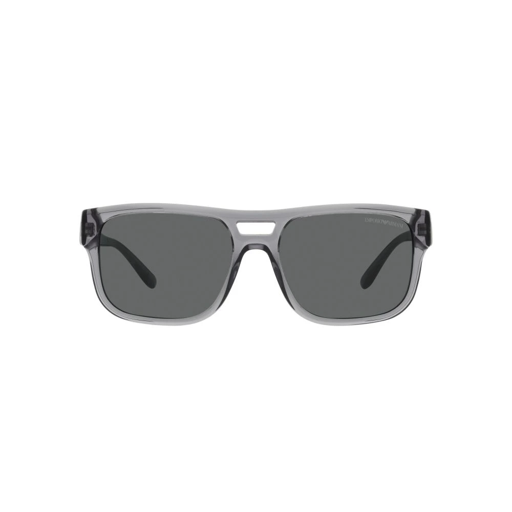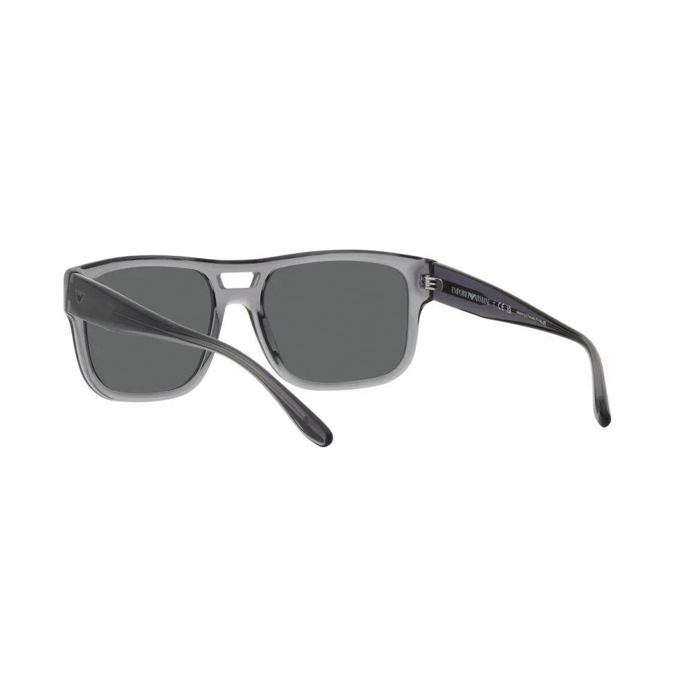 Men’s sunglasses featuring a geometric silhouette on an eco-friendly bio-acetate construction, blending design and sustainability. Double-bridge construction with transparent details and printed Emporio Armani logo.