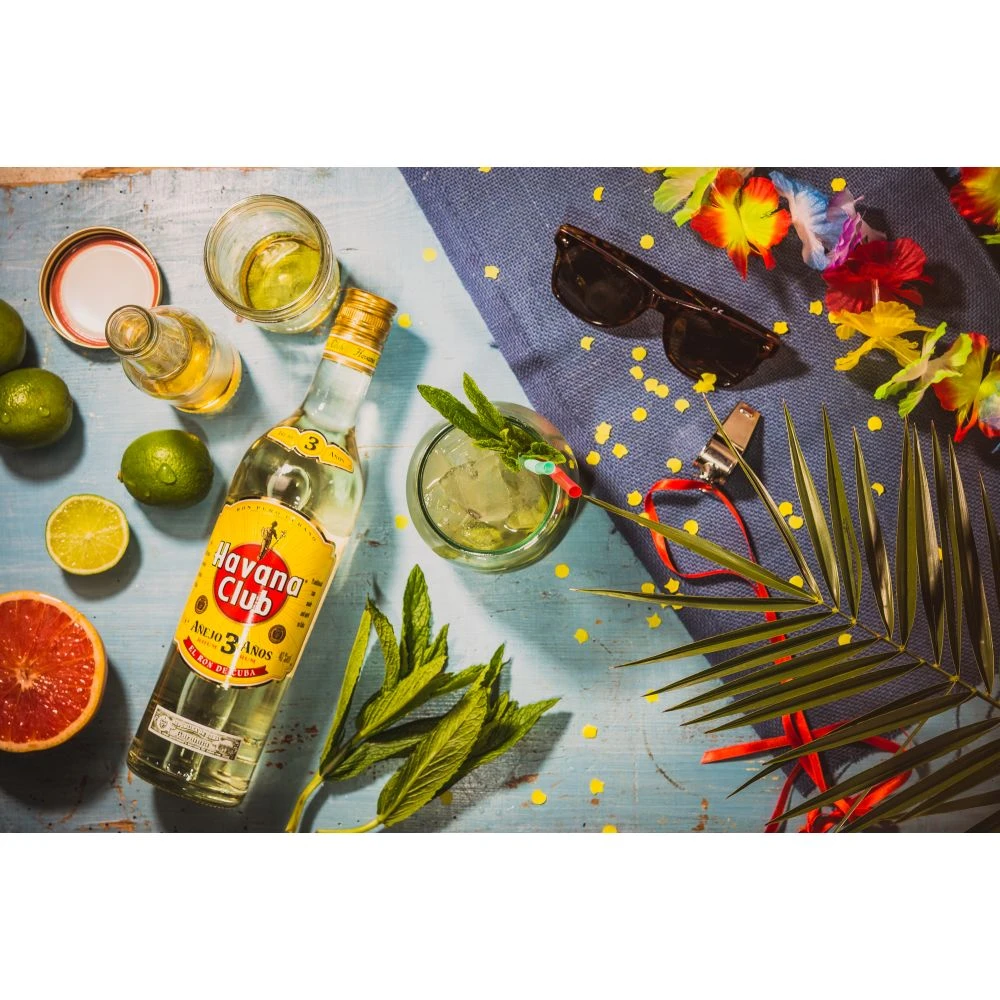 | How to enjoy Best | Havana Club 3 Year Old is ideal for creating authentic Cuban cocktails, like the Mojito and the Daiquiri. Make the authentic Cuban Mojito: 1. Mix the juice of half a lime and 2 teaspoons of white sugar in a glass. 2. Muddle 2 whole sprigs of fresh mint in the glass. 3. Mix in 4 caps of Havana Club 3 Year Old and ice, then top up with sparkling water. Stir well. Enjoy responsibly. |