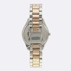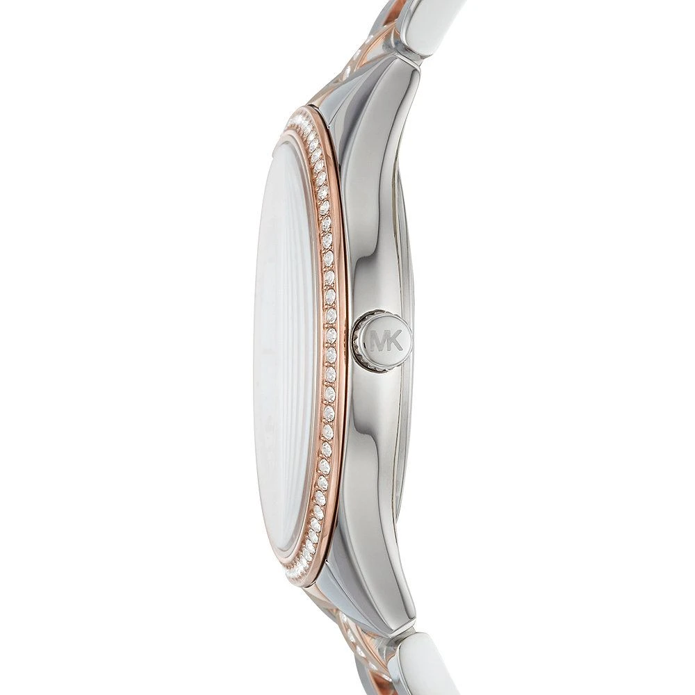 This 33mm watch features a white mother-of-pearl dial with rose gold-tone Roman numerals and stick indexes, glitz topring and two-tone stainless steel bracelet.