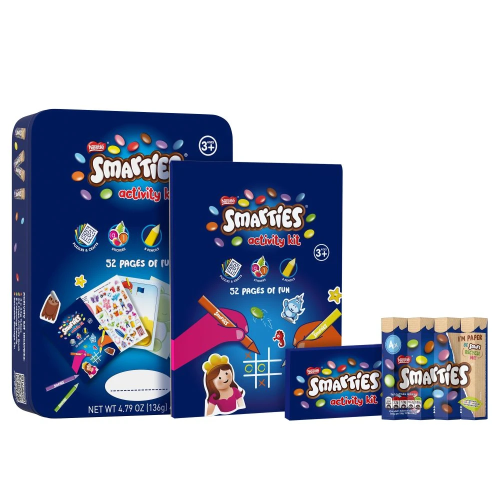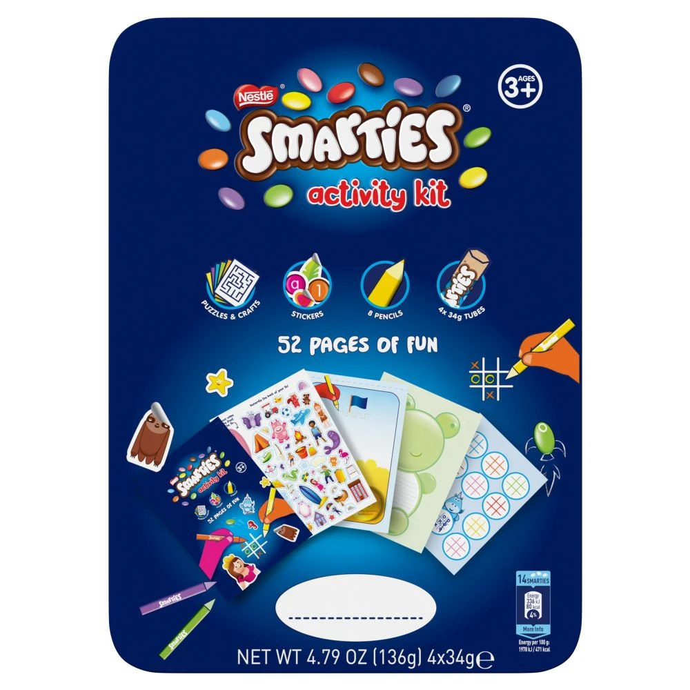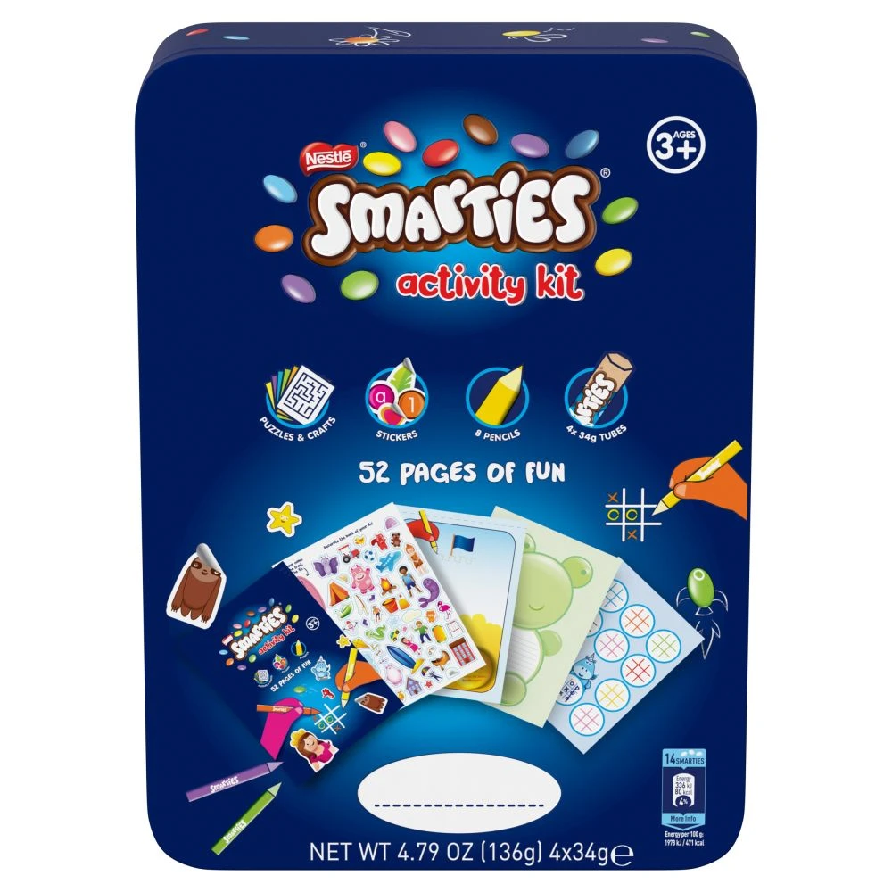 Encourage imaginative play with the Nestle Smarties Activity Kit Tin. You’ll find plenty to keep them occupied on the journey, with a fun activity book bursting with puzzles, games, stickers and 8 coloured pencils so they can experiment with colour and develop their creativity. • Bring their journey to life with colourful creative fun and the delicious chocolate of four 34g tubes of Smarties for a tasty treat anywhere. Smooth milk chocolate inside crispy, colourful shells made with no artificial colours or flavours. Learn through play, the sustainable way. • Exclusive to travel retail. •100% certified sustainable cocoa beans sourced through the Nestle Cocoa Plan.